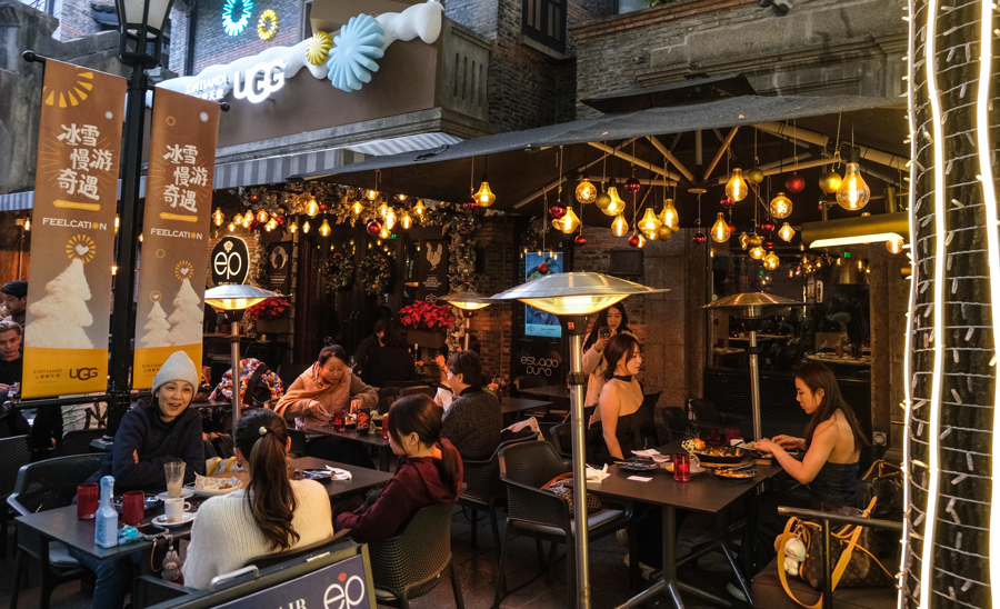 傍晚,女性市民游客正在新天地酒吧外摆位上享用美食,感受魔都夜色