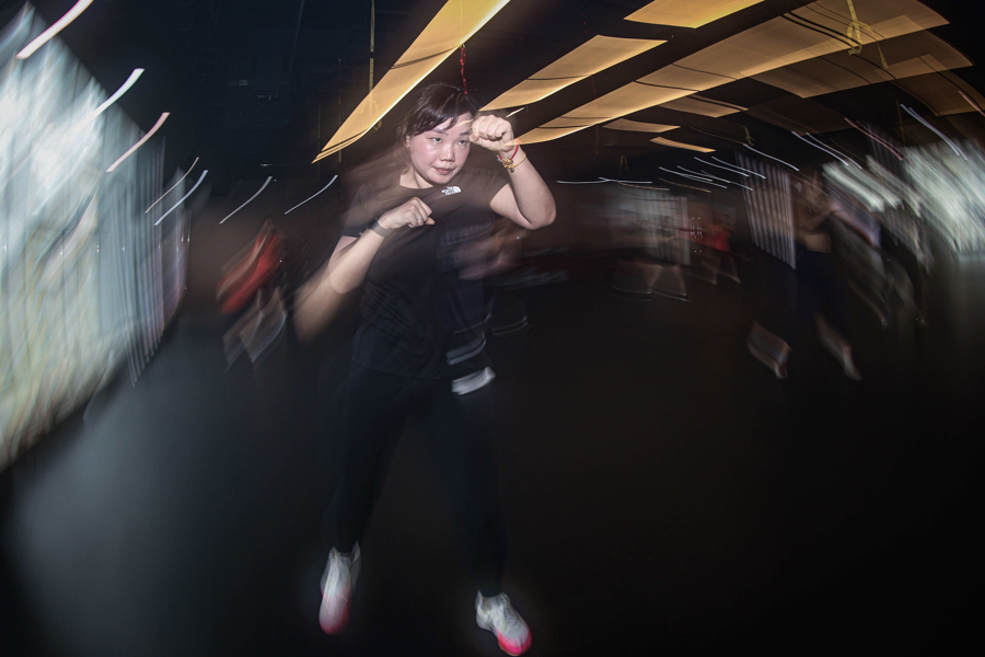 上海城市运动中心的团课室内,女性消费者正在教练的带领下挥汗如雨