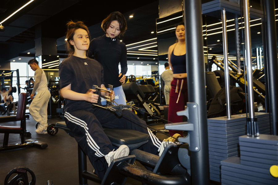 上海城市运动中心内,女性消费者在教练的指导下正在进行力量训练