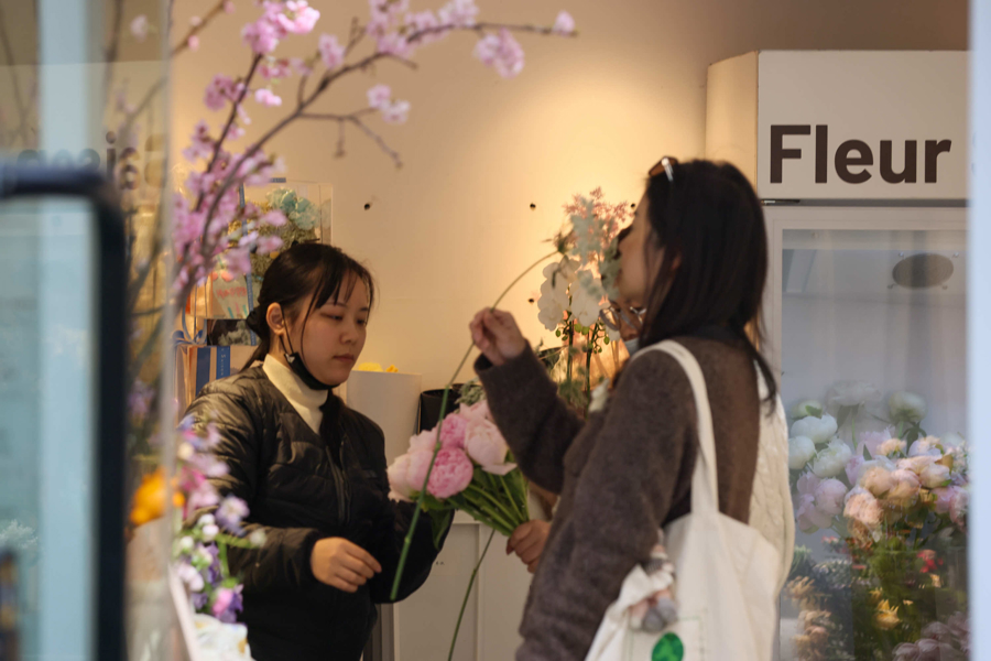街头花店蕴含生机,几位女士进店购买鲜花,带着春天的芬芳回家